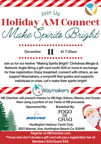 Join us for our festive "Making Spirits Bright" Christmas Mingle & Network Jingle AM Connect on Thursday, December 11 2025. To register, simply bring a gift card valued at $25 or more (Target, Amazon, Walmart, grocery stores, etc.). Your registration fee will be waived with your generous donation.